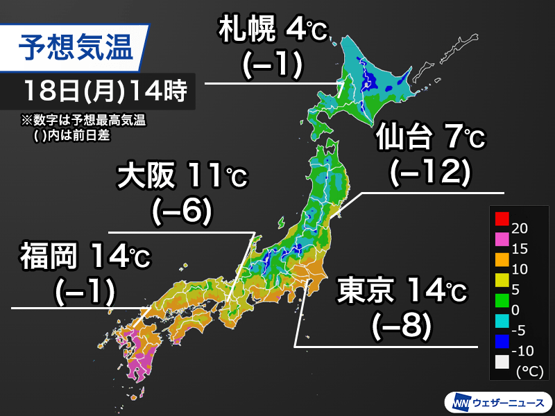 東京都心の最高気温は今日に比べて8℃低い14℃、大阪市は6℃低い11℃の予想です。北日本ほどではないものの北西の冷たい風が強く吹くため、寒く感じられる所が多くなります。