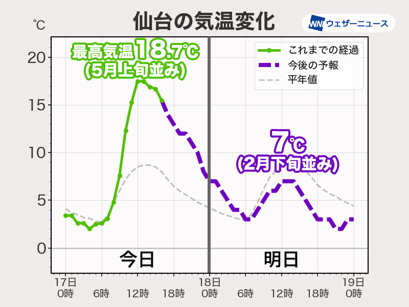 今日の最高気温が5月上旬並みの18.7℃まで上がった仙台市は、朝の冷え込みこそ今朝と大きく変わらないものの、昼間は晴れても気温が低いままとなります。最高気温は今日に比べて約12℃も低い7℃の予想で、2月下旬並みの寒さです。