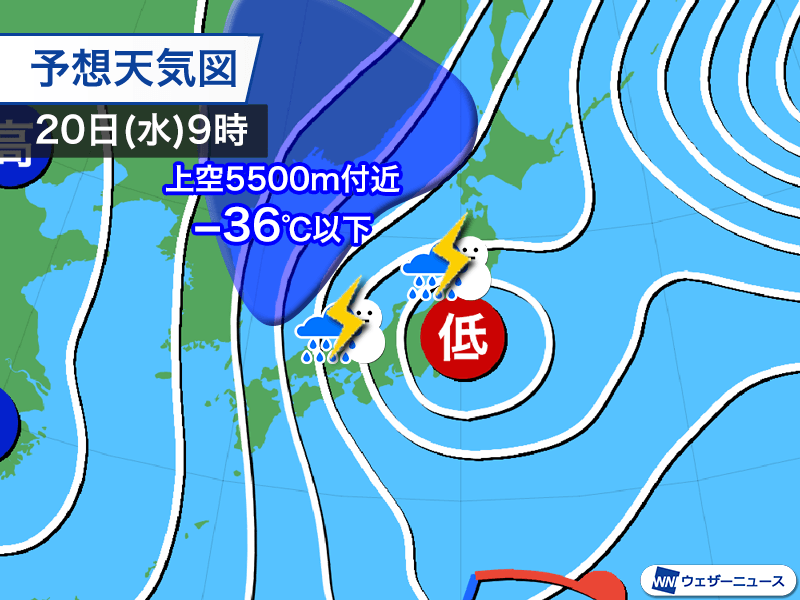 上空5500m付近で−36℃以下の、この時期としては非常に強い寒気を伴った低気圧が19日(火)に日本海を進み、20日(水)の春分の日にかけて本州付近を通過する予想となっています。