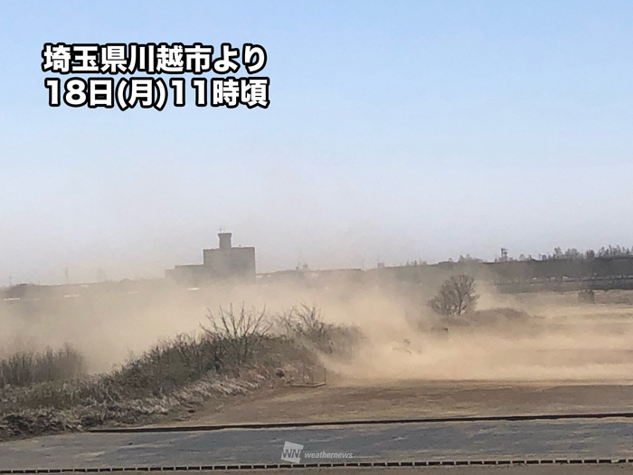 冷たく乾いた風で一部では湿度が20%を割り込むなど空気が乾燥し、砂が舞い上がりやすくなっています。埼玉県や千葉県を中心に大量の砂埃で視界が悪くなるほどで、午後も同じような状況が続く見込みです。