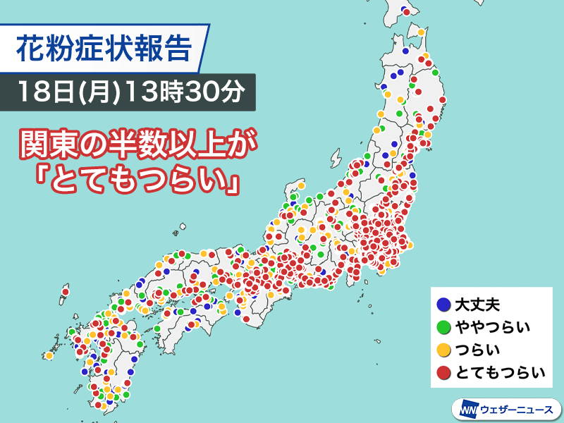 ウェザーニュースアプリ利用者からの花粉症状報告では、13時30分までの12時間の集計で関東の半数以上の方が「とてもつらい」と回答していて、「つらい」と合わせると8割近くに達しています。東海や東北太平洋側でも「とてもつらい」の割合は40〜50%と高く、多くの人に症状が出ている状況です。