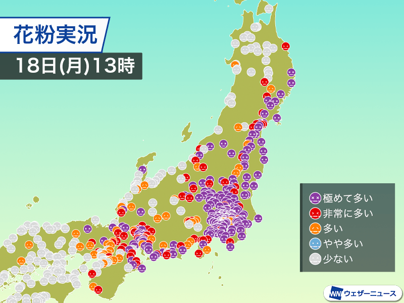ウェザーニュースが独自に設置している花粉観測機・ポールンロボによる観測結果では、関東平野のほぼ全域や福島県から岩手県にかけての太平洋側で「極めて多い」ランクに達していて、東海でも「非常に多い」や「極めて多い」ランクの所が目立ちます。