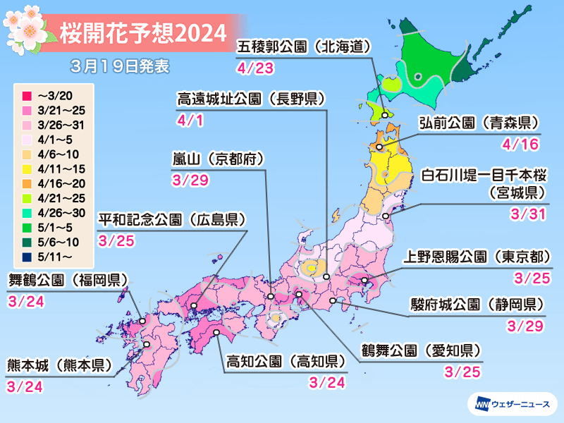 ウェザーニュースでは今日3月19日(火)、2024年の「第七回桜開花予想(速報版)」を発表しました。2024年の桜の開花は関東から西では平年並のところが多いですが、九州や東海の一部では平年より遅くなるところもある予想です。いよいよ今週末23日に広島で開花が始まり、24日には東京や福岡、高知、岐阜で開花する見込みです。