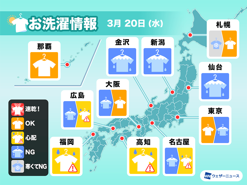 関東や東海など太平洋側は、朝の時点では晴れていても天気が急変する可能性があるため油断ができません。今日は部屋干しが良さそうです。