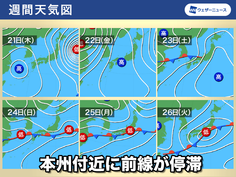 その後は来週の前半にかけて本州付近に前線が停滞し、西日本、東日本を中心に曇りや雨の日が続きます。前線上を低気圧が通過する時には雨の強まる所がある予想です。