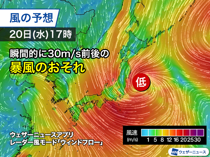 今日午後の風の分布を見ると、西日本から東日本の広範囲に濃い赤色で示された平均風速20m/s以上のエリアが広がります。