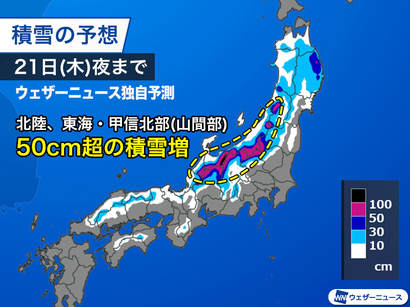 本州山沿いは21日(木)にかけて大雪のおそれ