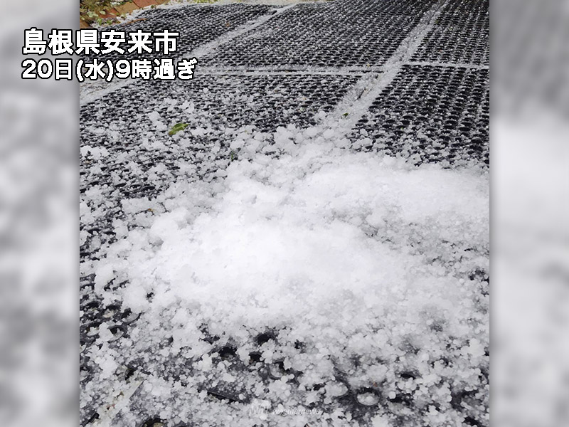 低気圧の接近と共に、上空約5,500mには−36℃というこの時期にしては非常に強い寒気が流れ込んでいます。地上との気温差が大きくなり、大気の状態が不安定になって雨雲・雪雲が急速に発達、中国や近畿では局地的に雨雪に加えてアラレや雹が降っています。