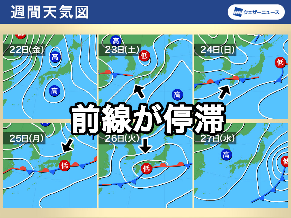 週末の23日(土)になると高気圧は足早に東の海上に去って西から前線が接近し、次第に雨のエリアが拡大します。その後は来週の前半にかけて本州付近に前線が停滞する予想で、西日本や東日本を中心にスッキリしない空の日が続き、太平洋側を中心に雨の強まるタイミングがある予想です。