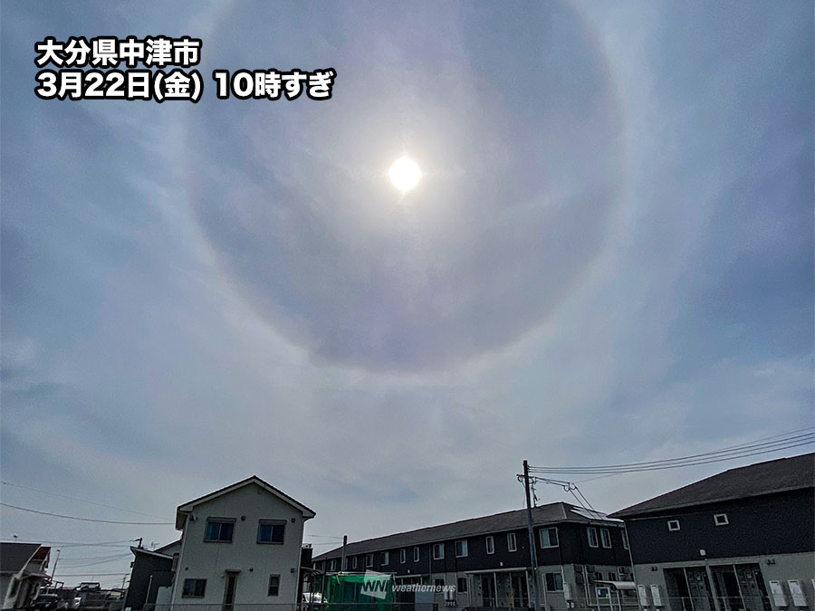 西日本は朝から晴れていますが、上空の高い所を薄雲が通過しています。この薄雲を構成する氷の粒が太陽の光を屈折させることで、特定の角度の円周上に光が強く見える部分ができ、これがハロ(暈 かさ)と呼ばれます。