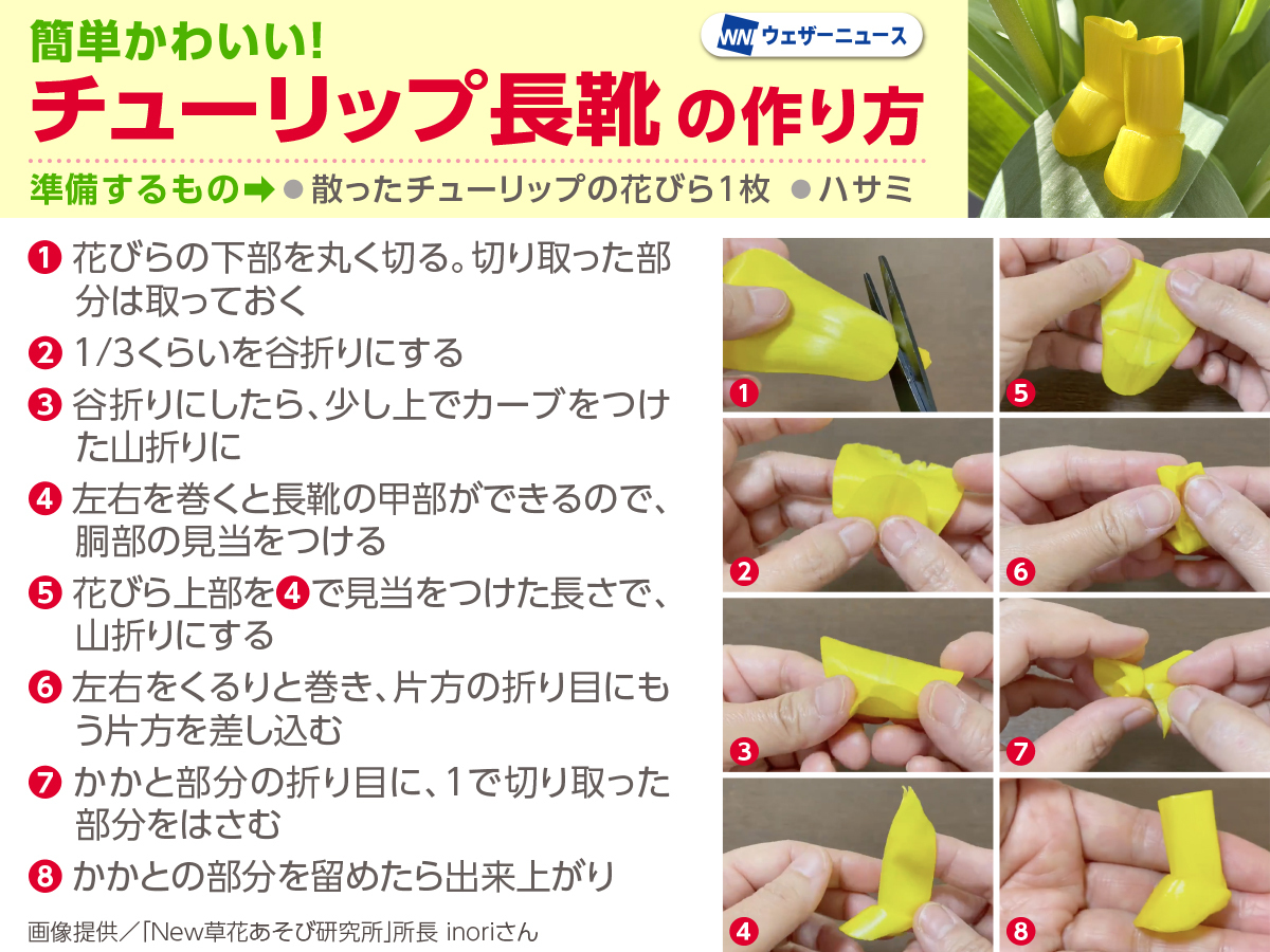 inoriさんは、日々簡単で楽しい草花あそびを考え、これまでにオリジナルの草花あそび・草花工作を700種類以上も考案してきましたが、その1つがチューリップの花びらで作った長靴です。きっかけは黄色いチューリップの花びらだったといいます。