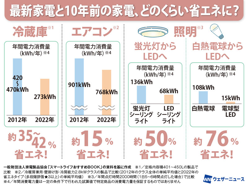 家の中で電気を特にたくさん消費している電化製品はエアコンと冷蔵庫です。たとえば、20年前の冷蔵庫を最新のものに買い替えた場合の電気代は、年間で約1万円も節約できます。電気代の節約は温室効果ガスの排出削減も意味しています。