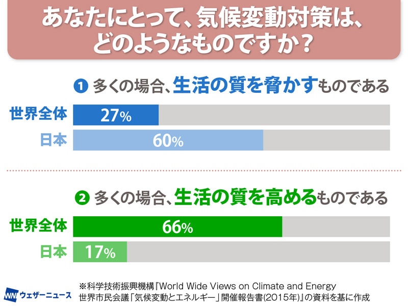 『あなたにとって、気候変動対策は、どのようなものですか?』と尋ねた、2015年の国際的な調査によると、『多くの場合、生活の質を脅かすものである』と答えた人は世界平均で約27%だったのに対して、そう答えた日本人は60%もいました。