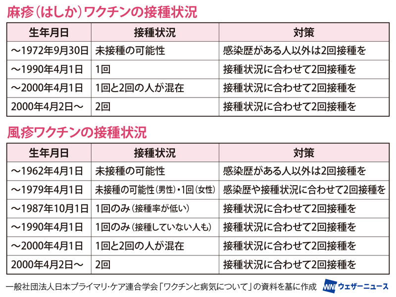 厚生労働省「麻しんについて」、同「麻しんの国内外での増加に伴う注意喚起について(再周知)」、同「風しんの追加的対策について」、同「麻しん(はしか)に関するQ&A」、国立感染症研究所所「風疹とは」、同「風疹Q&A(2018年1月30日改訂)」、一般社団法人日本プライマリ・ケア連合学会「ワクチンと病気について」