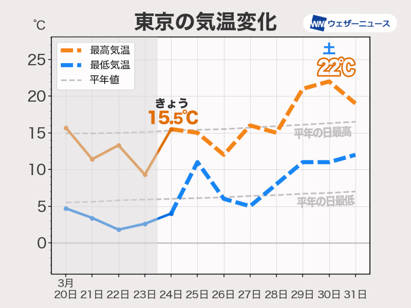 東京の気温変化を見ると、最低気温は平年を上回る日が多い予想です。最低気温が10℃以上の日も多くなり、朝晩の冷え込みはだいぶ和らぐといえそうです。曇りや雨の日が多くなるため昼間の気温はそこまで高くなりませんが、ほぼ平年並みで推移しそうです。