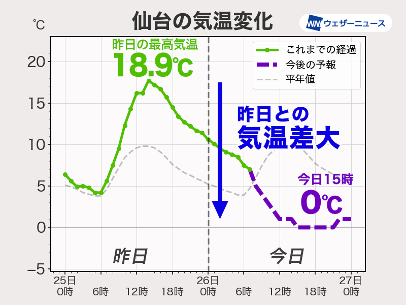 東北南部では、低気圧が引き込む上空の寒気の影響で、今日はどんどん気温が下がっていきます。昨日は20℃近くまで気温が上昇した仙台では、午後にかけても気温が下がり続け、今日15時の予想気温は0℃となっています。