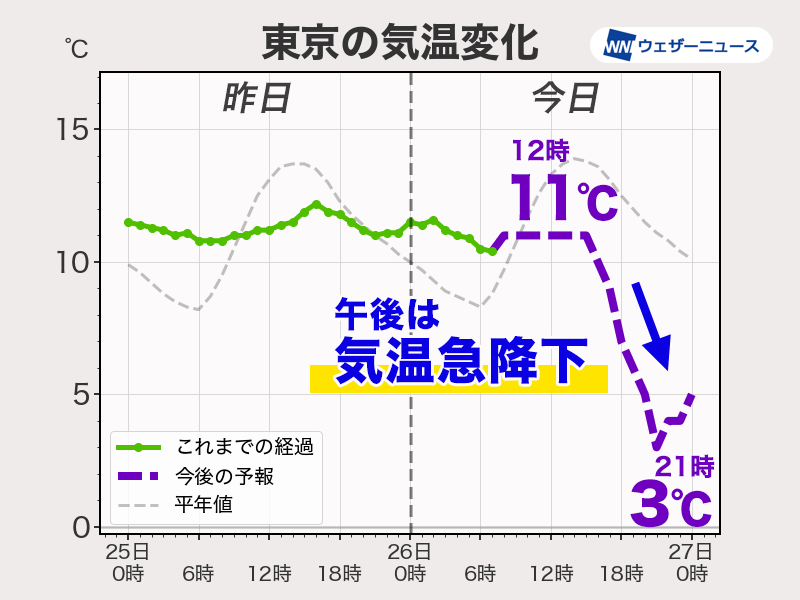東京では昨日の朝からほとんど気温変化がなく、今朝も雨は降っているものの冷え込んではいません。ただ、低気圧が関東の南を通過した後は北寄りの冷たい風が強まり、気温が一気に下がる見込みです。