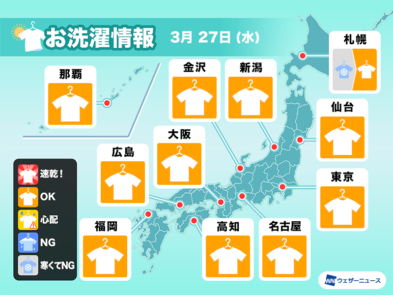 移動性高気圧の圏内で全国的に晴れて穏やかな春の陽気となります。外干しの洗濯物もよく乾きそうです。ただ、花粉飛散が心配なので、花粉症の方がいるご家庭では部屋干しが良さそうです。