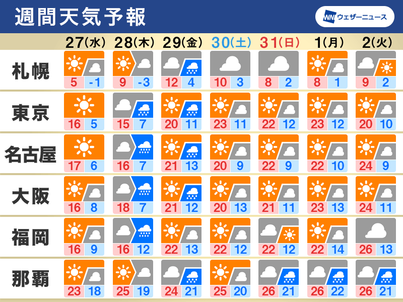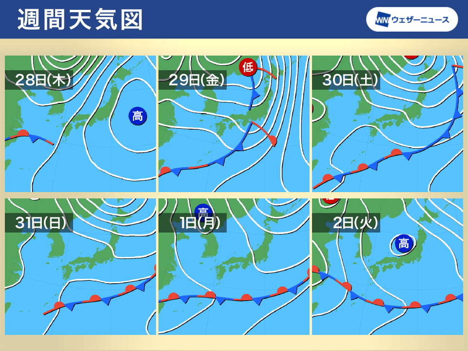 この先一週間は天気が周期的に変わります。28日(木)からは低気圧や前線が近づき広範囲で天気が崩れる見込みです。週末は春本番の暖かさとなります。