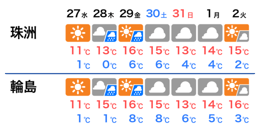 この先一週間は能登半島でも天気は周期的に変化します。28日(木)〜29日(金)は天気が崩れ、雨が降る見込みです。