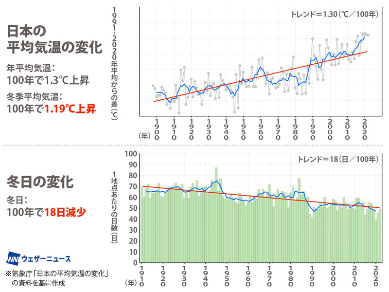 「気象庁発表のデータによると、1890(明治23)年からの100年間で冬の平均気温は1.19℃上昇。さらに冬日(1日の最低気温が0℃未満になった日)も100年間で18日も減少しています。