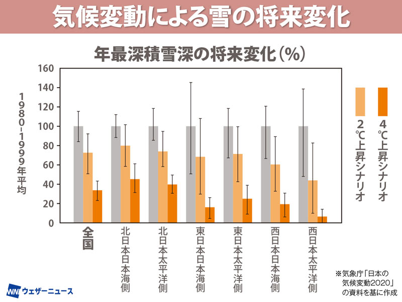 それによると、2015年に採択されたパリ協定で掲げられた2℃上昇シナリオ(世界平均気温の上昇を産業革命前を基準に2℃よりかなり低く抑え、さらに1.5℃より低く抑える努力を追求すること)が実現できた場合でも、降雪量は1980〜99年の平均値を100とした場合に比べて約30ポイント近く減少するデータが出ています」(モリタ)