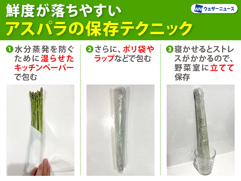 アスパラガスは鮮度が落ちやすい野菜で、保存にも気をつかう必要があるそうです。