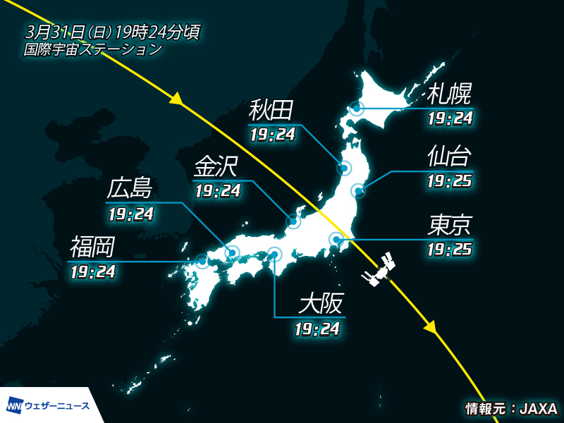 今日の夜は、北日本で国際宇宙ステーションの観測チャンスがあります。ただ、西〜東日本では雲が広がりやすくなるため、ISSを見るのは難しそうです。