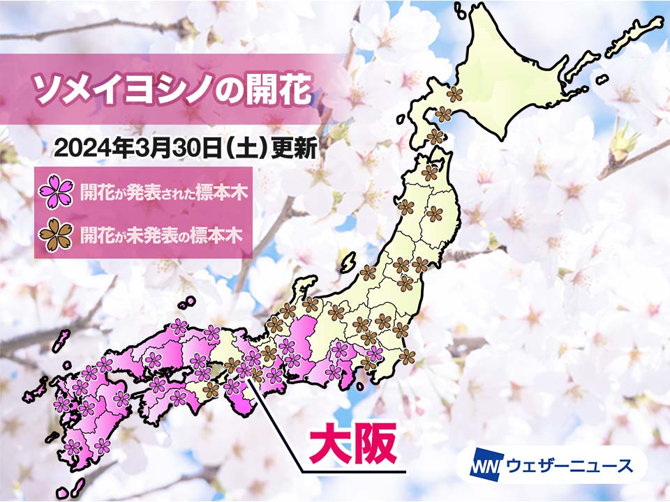ソメイヨシノの開花は昨日から今日にかけて14地点が増え、計24地点になりました。全地点で昨年よりも遅い開花となっています。
