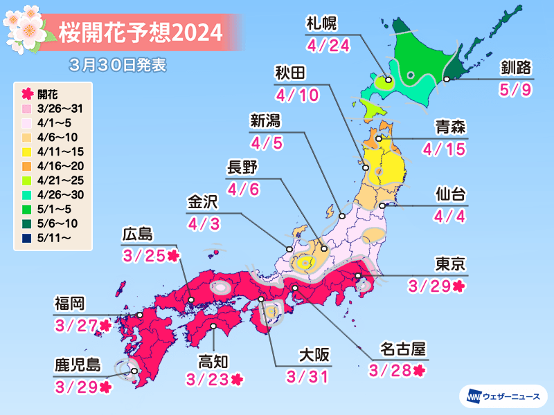 ウェザーニュースの桜開花予想では、今年の桜の開花は東日本や西日本で平年並みかやや遅い傾向となっています。北日本や北陸では平年より早い所が多くなるとみられます。