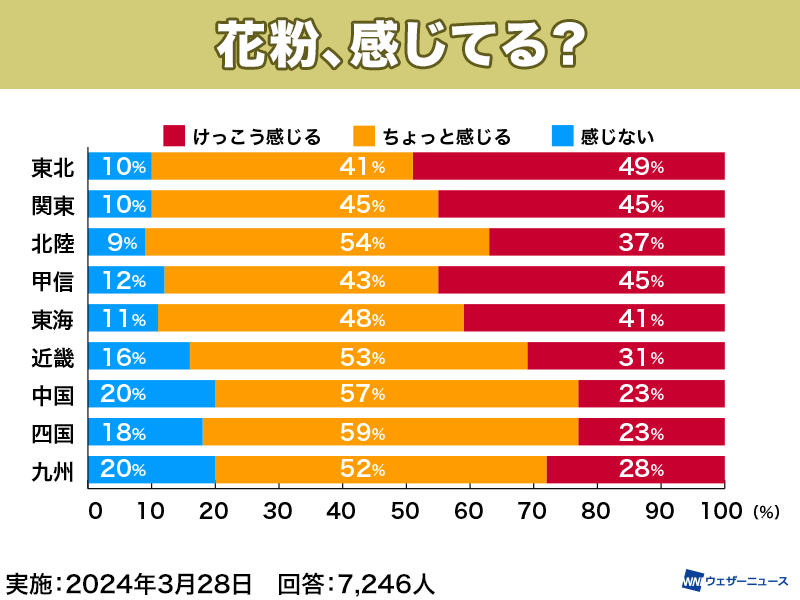 すでにヒノキ花粉の飛散が本格化している九州では、4月上旬まで本格的な飛散が続きます。現在スギ花粉の飛散ピークとなっている東北北部では本格的な飛散が4月中旬まで続く予想です。