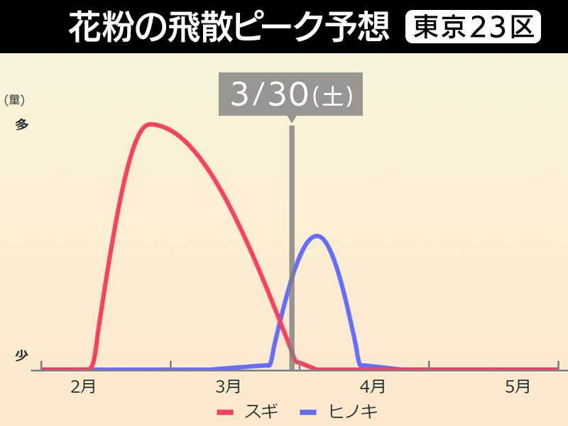 今後、中国・四国から東北南部ではスギ花粉の飛散が減少し、4月上旬から中旬にかけてヒノキ花粉が本格的に飛散する見込みです。