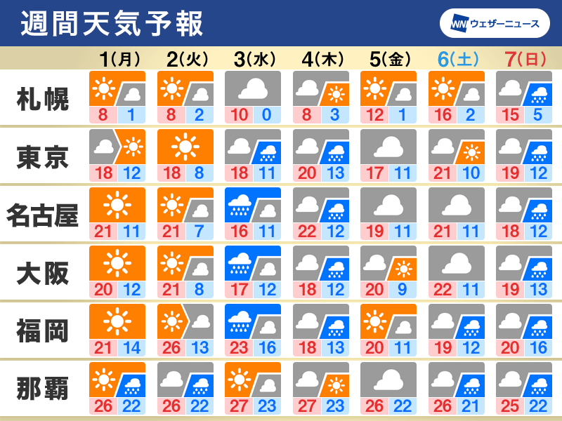 全国的に気温はこの時期としてはやや高めで、4月後半〜5月頃の暖かさになる所が多そうです。最高気温が25℃以上の夏日も予想されています。いよいよ寒さは和らぎそうです。