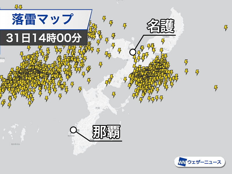 沖縄では、午後になって渡嘉敷村で1時間に36.0mmの激しい雨が、また本島の名護市でも1時間に20mm以上の強い雨が降っています。また、活発な雲の下では落雷も次々と発生している状況です。
