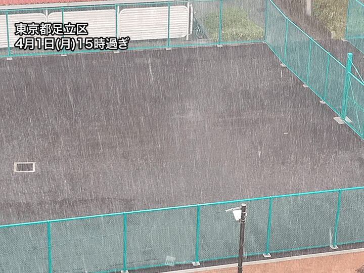 活発な雨雲の下では土砂降りの雨になっていて、雷や霰(あられ)も伴っている状況です。雨雲がそれほど大きくはないため、強雨が長く続くことはありません。