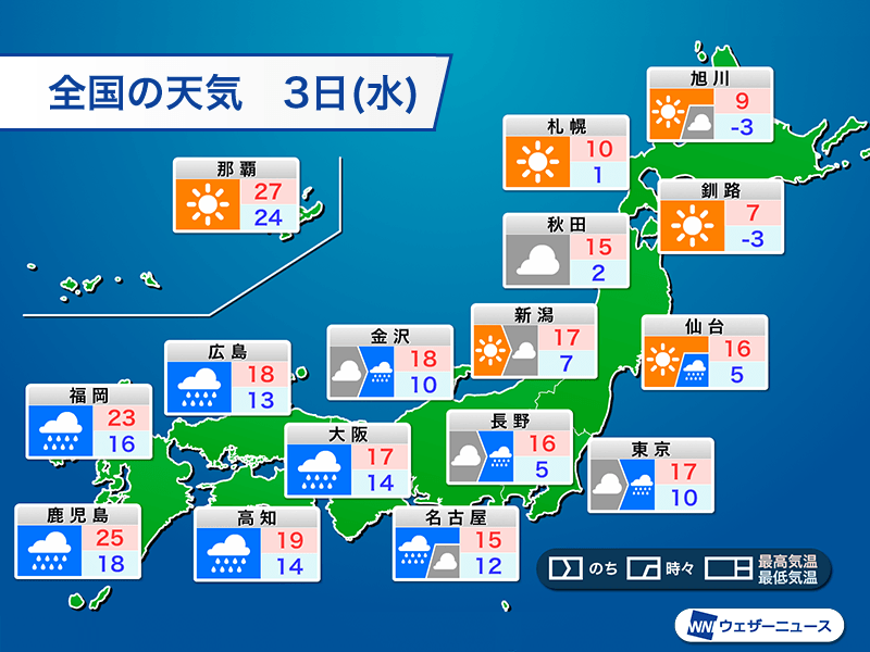 昼間は日差しが届かない割に気温が高く、鹿児島市は25℃、福岡市で23℃と蒸し暑く感じられるくらいになります。大阪市、東京都心も17℃で、ほぼ平年並みの気温です。それほど厚手の上着がなくても十分にしのげます。