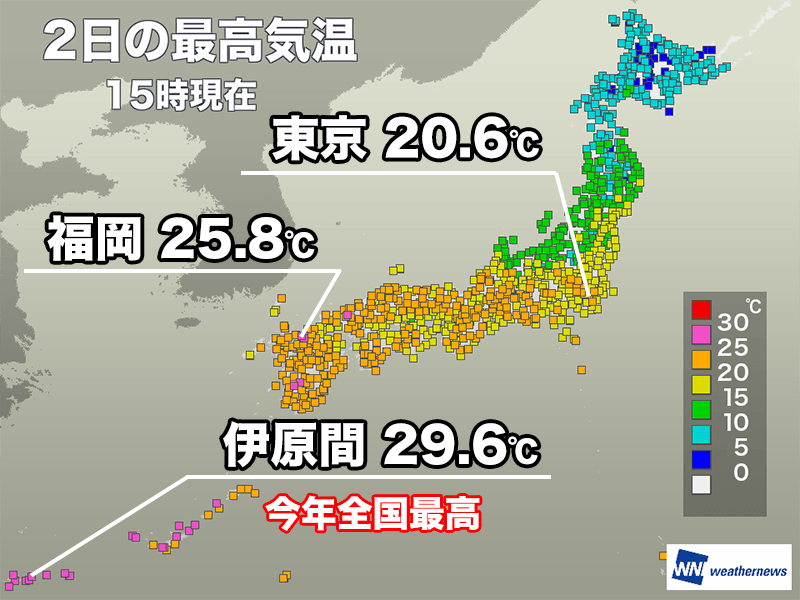 西日本、東日本は午前中を中心に日差しが届いて気温が上がり、広い範囲で20℃を上回りました。福岡市は25.8℃で今年始めての夏日を観測。東京都心も昨日より少し高く20.6℃まで上がっています。