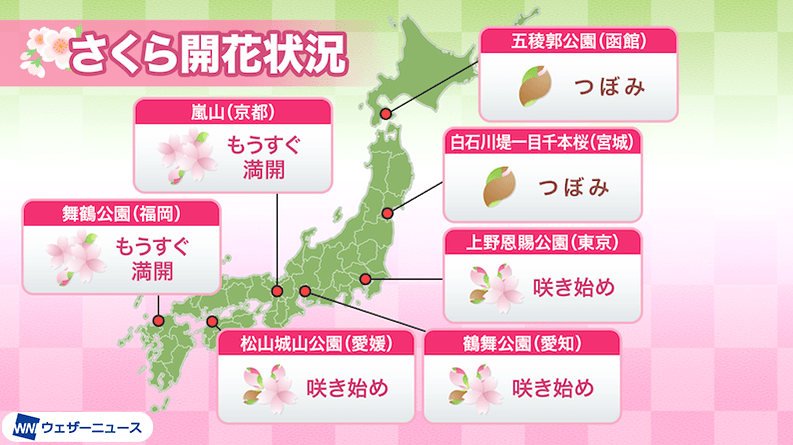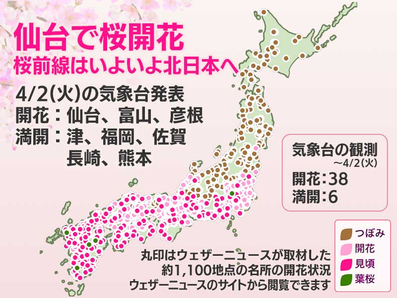 今日の桜開花状況 4月2日(火) 桜前線は東北へ到達 福岡などは満開に