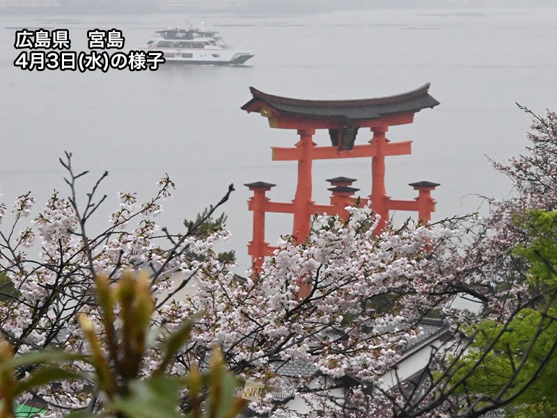 南岸に停滞する前線の影響で、四国は太平洋側の地域を中心に雨が降りやすくなります。お花見に行く際は折りたたみ傘をお持ちください。中国・四国ともにお花見は6日(土)の方がおすすめです。気温は高く、昼間は上着なしでも過ごせそうです。