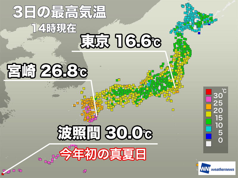 沖縄から奄美にかけては上空1500m付近で+18℃前後の夏のような暖気に覆われています。日差しが届いたことで気温が上がり、14時00分までの最高気温は沖縄県竹富町・波照間で30.0℃を観測。全国で今年初めてとなる真夏日です。
