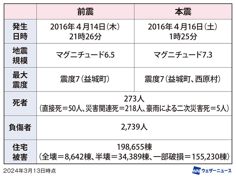 熊本地震では2016年4月14日発生の前震がM6.5、16日の本震がM7.3を観測。共に最大震度7の大きな揺れを生じ、熊本県のまとめでは直接の地震被害による死者が50人、重軽傷者が2376人、住家の損壊が約20万棟に達しました。