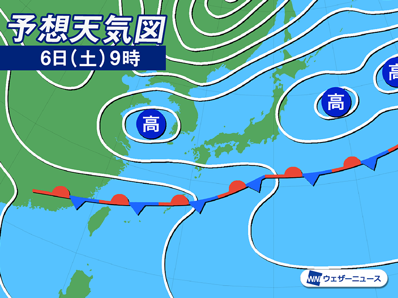 今日6日(土)は、高気圧に覆われる日本海側の各地は穏やかな晴天となる見込みです。