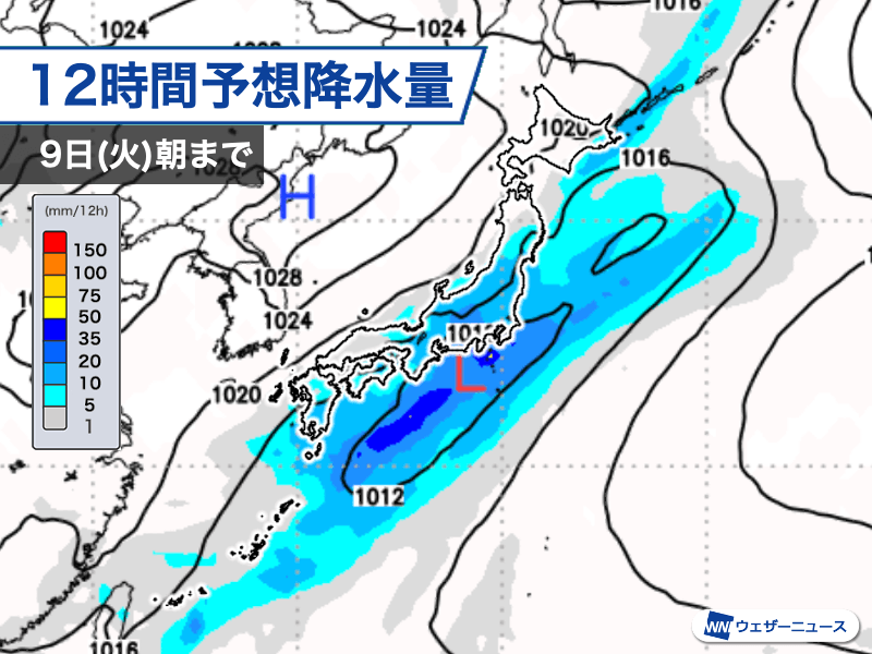 低気圧に近い太平洋側の地域では、沿岸部を中心に一時的に降り方が強まるおそれもあります。特に関東は、9日(火)朝の通勤・通学時間帯に雨のピークが重なる可能性があるため、時間に余裕を持って行動するようにしてください。入学式を迎える所も多くなると思いますが、濡れたものを拭くタオルがあると良さそうです。