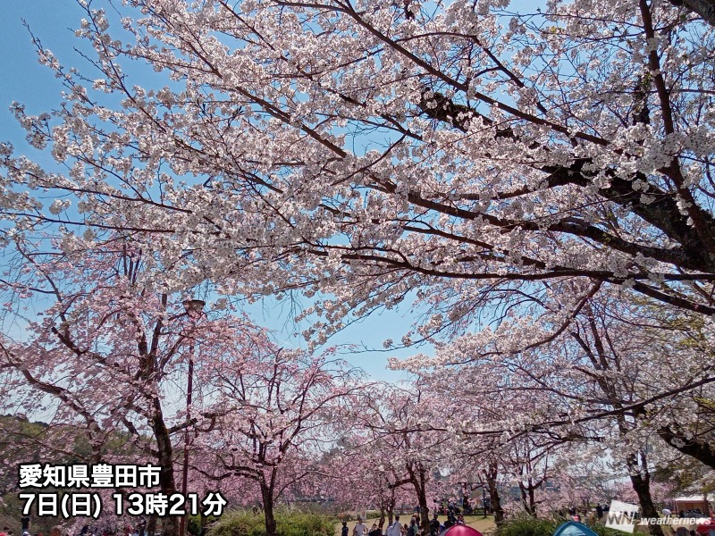 今日7日(日)の本州は高気圧の圏内で、昨日6日(土)よりも晴れている所が多くなっています。関東や東海、西日本では見頃になった桜が青空に映えて綺麗です。気温も20℃を超えて暖かく、絶好のお花見日和になっています。