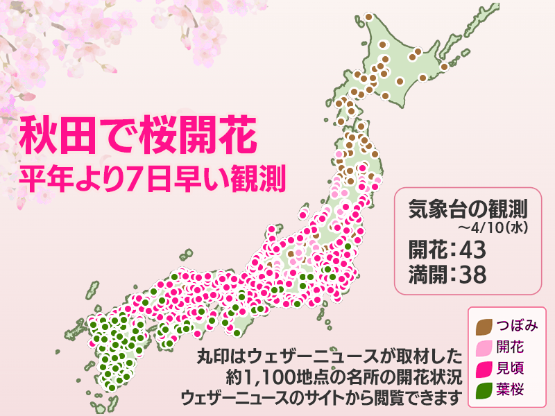 4月10日(水)の開花・満開発表状況