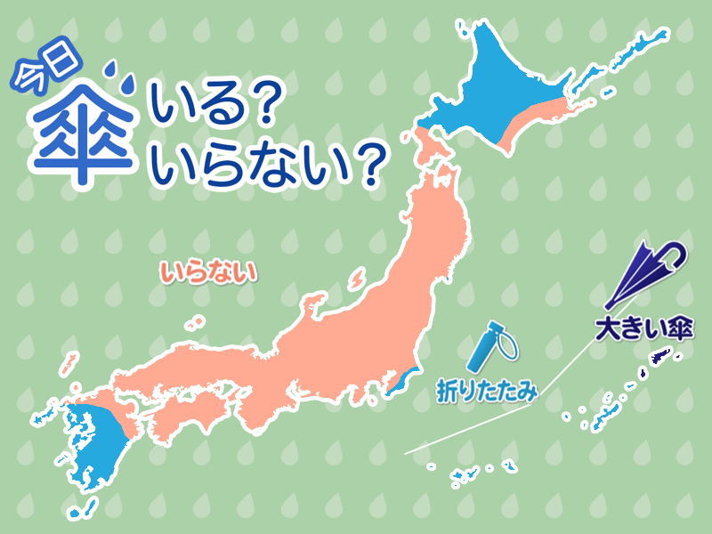 九州は南部を中心ににわか雨の可能性があり、北海道でも午前中ほど雨の降るところがあります。