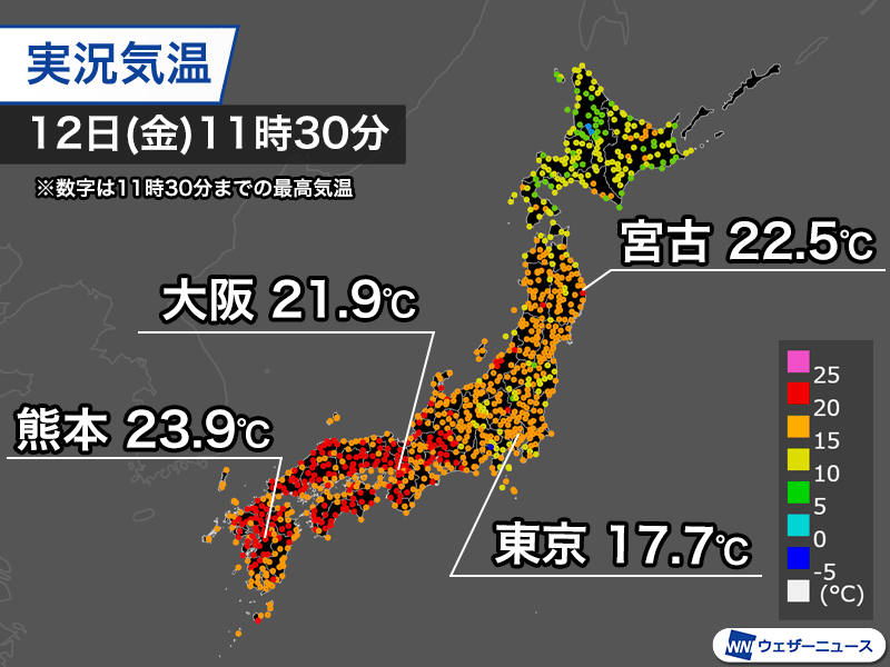 11時30分までの最高気温は熊本市で23.9℃、大阪市、名古屋市では21.9℃を観測するなど、昨日よりも速いペースで気温が上昇中です。北日本でも岩手県宮古市で22.5℃、秋田県横手市で21.4℃と一部で20℃を上回りました。
