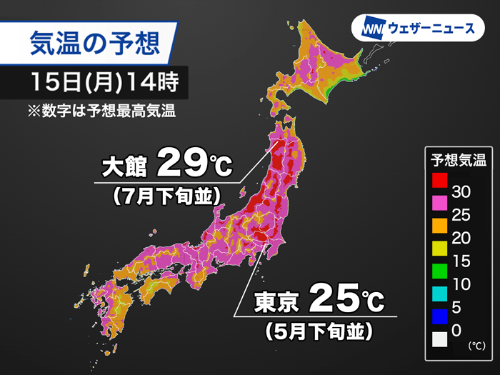 予想最高気温は秋田市で27℃、盛岡市でも26℃と、今年初めて夏日になるとみています。秋田県大館市では真夏日に迫る29℃まで上がる予想で、7月下旬並の暑さとなる予想です。