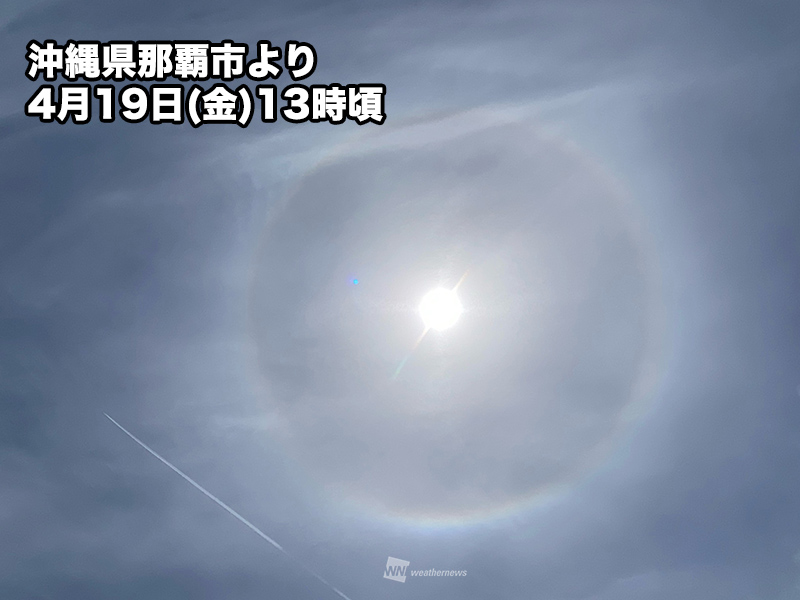 ハロが見られると天気が下り坂になることがありますが、沖縄では天気が崩れることはなさそうです。一方、九州は徐々に雲が厚くなり、明日20日(土)は九州や中国・四国で雨が降り出す予想です。外出の際は、傘があると安心です。