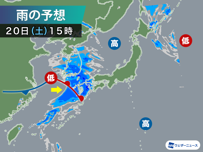 低気圧からのびる温暖前線が近づく九州から雨が降りだし、午後は中国・四国地方に雨雲が広がります。近畿でも夜は雨が降りだす可能性があります。